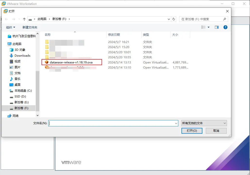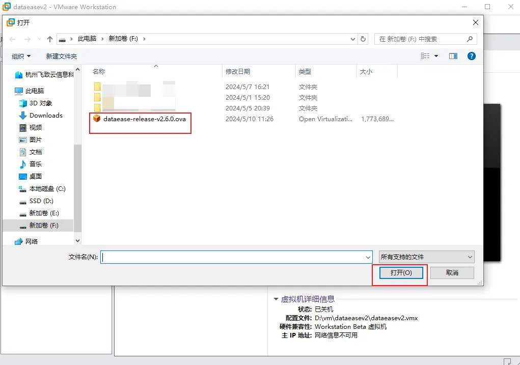 选择百度网盘下载的 ova 文件,点击“打开”;