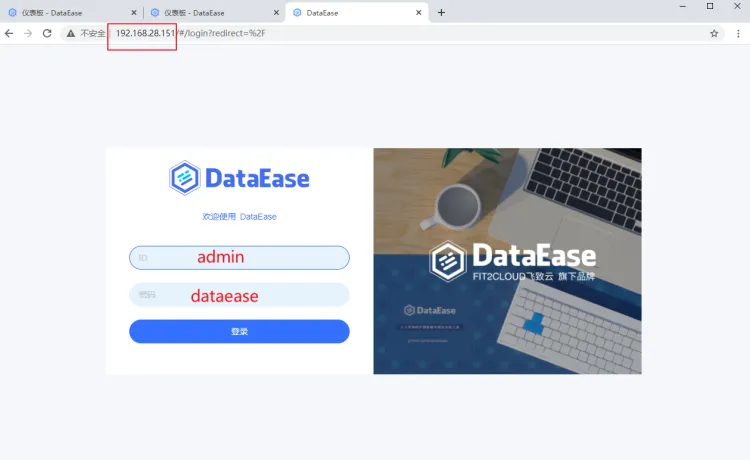 打开浏览器,输入虚拟机 IP,即可打开 DataEase v1 的登录界面;
